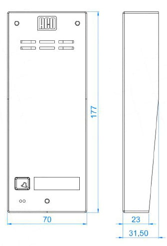 - 1 indywidualnie podświetlany przycisk wywołania. Zintegrowany z dolnym polem opisowym czytnik breloków zbliżeniowych Unique 125 kHz.