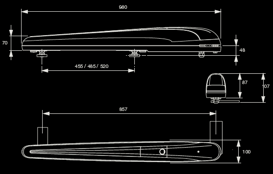 Siłowniki są przeznaczone do dużych i ciężkich skrzydeł. Maksymalna siła siłownika to aż 3500N. Jest stosowany również do mniejszych bram, zawieszonych na szerokich słupach, gdzie niema możliwości zamocowania odbojnika.