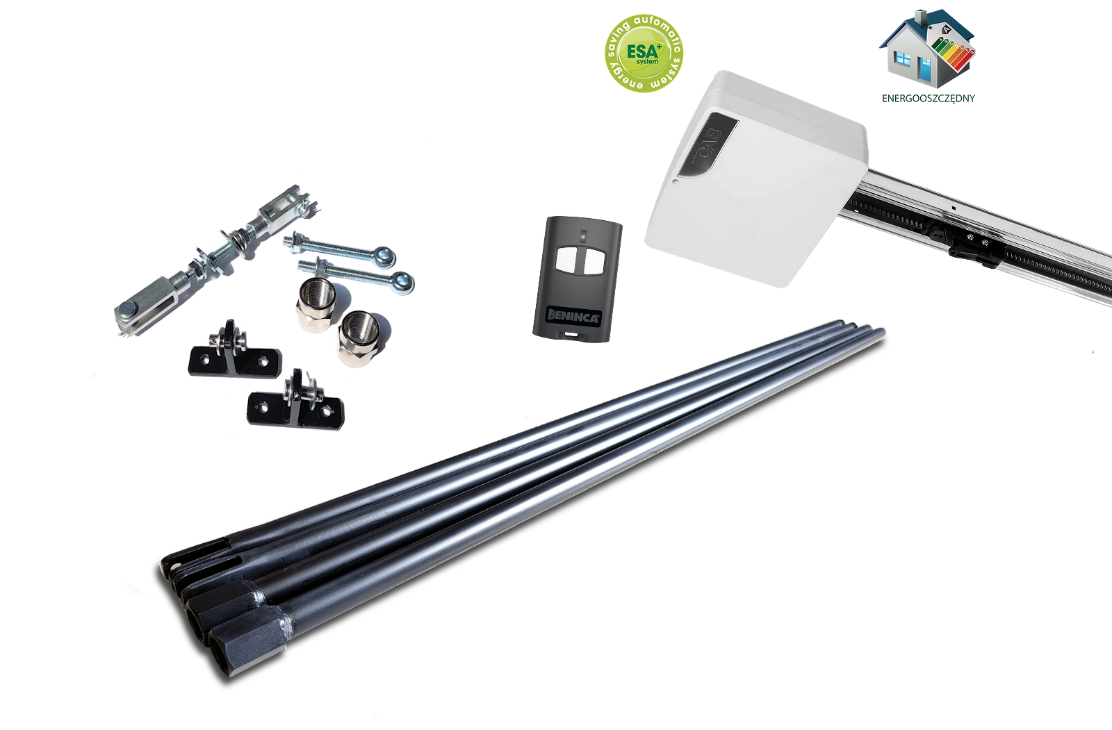 Nienawrotny silnik 24 Vdc do użytku intensywnego, wbudowana centrala z zasilaczem impulsowym 230 Vac ± 10% 50/60 Hz zapewnia niski pobór prądu oraz dłuższą żywotność. Centrala sterująca wyposażona w innowacyjny system (ESA+) zmniejszający zużycie energii co gwarantuje pobór prądu podczas czuwania poniżej 1 W.