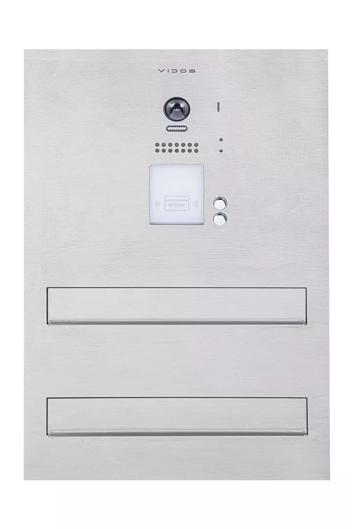 S1202A-SKM to dwuwrzutowa skrzynka na listy z wbudowanym panelem wideodomofonowym Vidos S1202A. Dwuabonentowa skrzynka z wbudowanym czytnikiem zbliżeniowym umożliwiającym otwieranie wejścia za pomocą karty lub breloków.