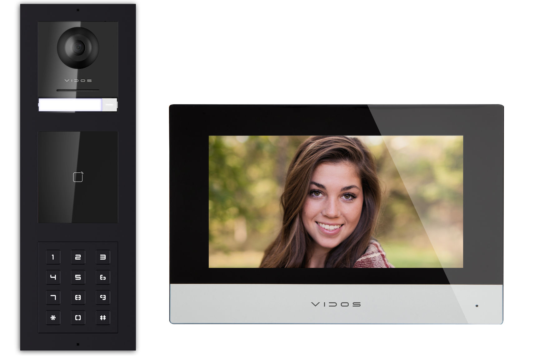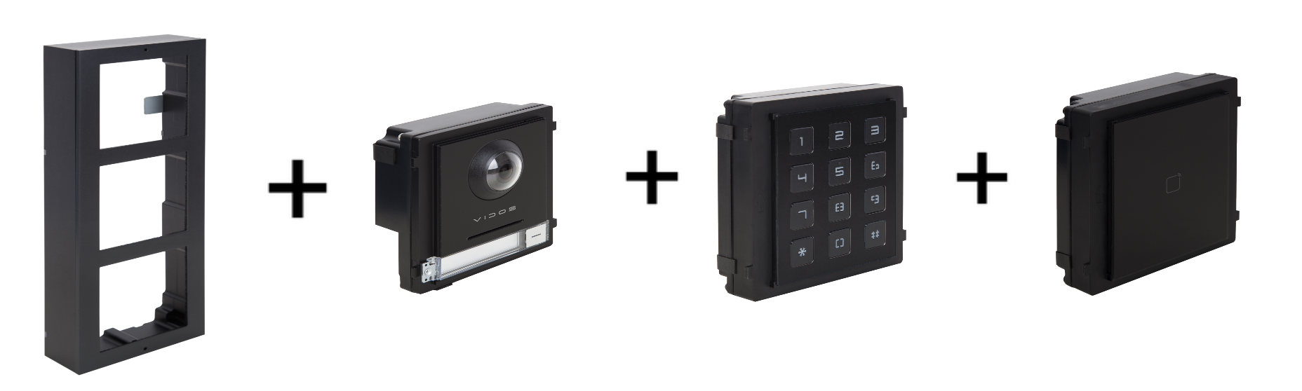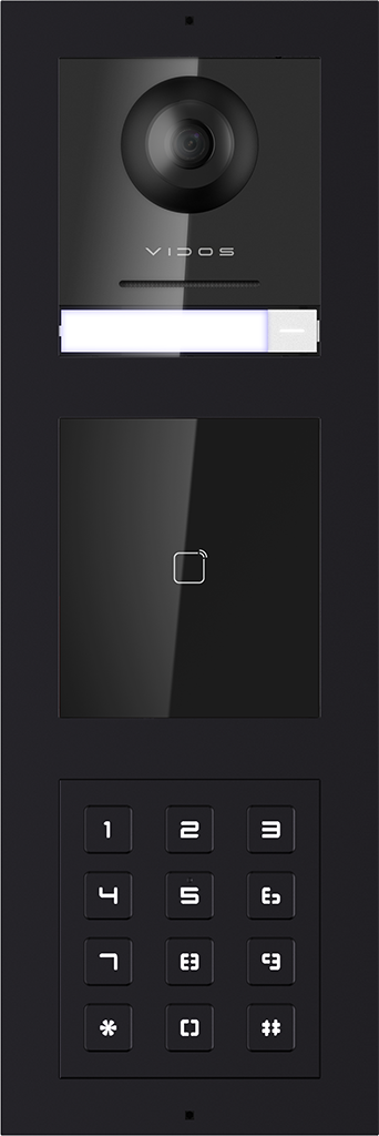 Zestaw wideodomofonowy Vidos ONE złożony z monitora IP M2010 oraz modułu głównego A2000-G i modułu czytnika RFID 125kHz A2000-EM oraz modułu klawiatury A2000-D wraz z estetyczną ramką montażową ( natynkowa lub podtynkowa do wyboru ).